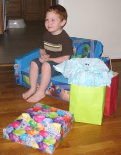 There was a little confusion involved in the extended celebration. We went to Toys R Us on Thursday to see what could be seen and make a mini-wishlist. While we were in the store, an associate made an announcement about a little girl who was in the store (apparently a member of the Geoffrey Birthday Club thing) who was having a birthday on that day. She signed off with, “Happy birthday!” Bennett yelled, “Thank you!” Which is just odd because his usual response when someone says, “Happy birthday!” is “Happy birthday!”