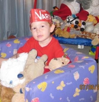 Really, it was only six days, but who’s counting? Bennett’s third birthday was this weekend, but Jeffrey really likes to celebrate stuff (which is how we ended up having an all-day “Yay! It’s Summer!” Party on June 21) so he started celebrating Bennett’s birthday on Wednesday. He decided a Varsity hat made a good birthday hat, so Bennett wore that for several days.